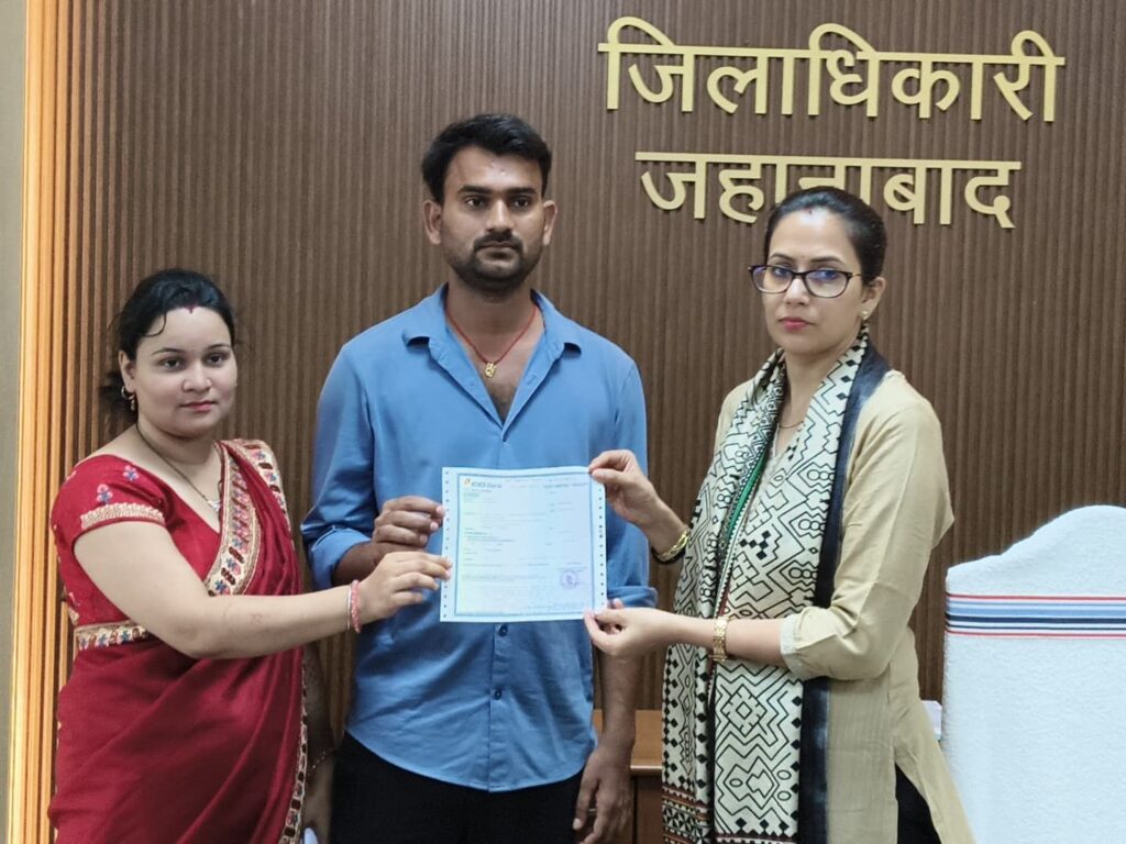 इसी क्रम में आज दिनांक 29 मई, 2025 को जहानाबाद की जिला पदाधिकारी श्रीमती अलंकृता पाण्डेय द्वारा मुख्यमंत्री निशक्तजन विवाह प्रोत्साहन योजना के तहत मोदनगंज प्रखंड अंतर्गत विशुनपुर ओकरी पंचायत निवासी श्री सोनू कुमार एवं उनकी पत्नी श्रीमती नीलू अनिल दुबे को ₹1,00,000 (एक लाख रुपये) का सावधि जमा प्रमाण पत्र प्रदान किया गया। यह राशि उन्हें राज्य सरकार की ओर से उनके विशेष विवाह को सम्मानित एवं सशक्त बनाने हेतु दी गई।