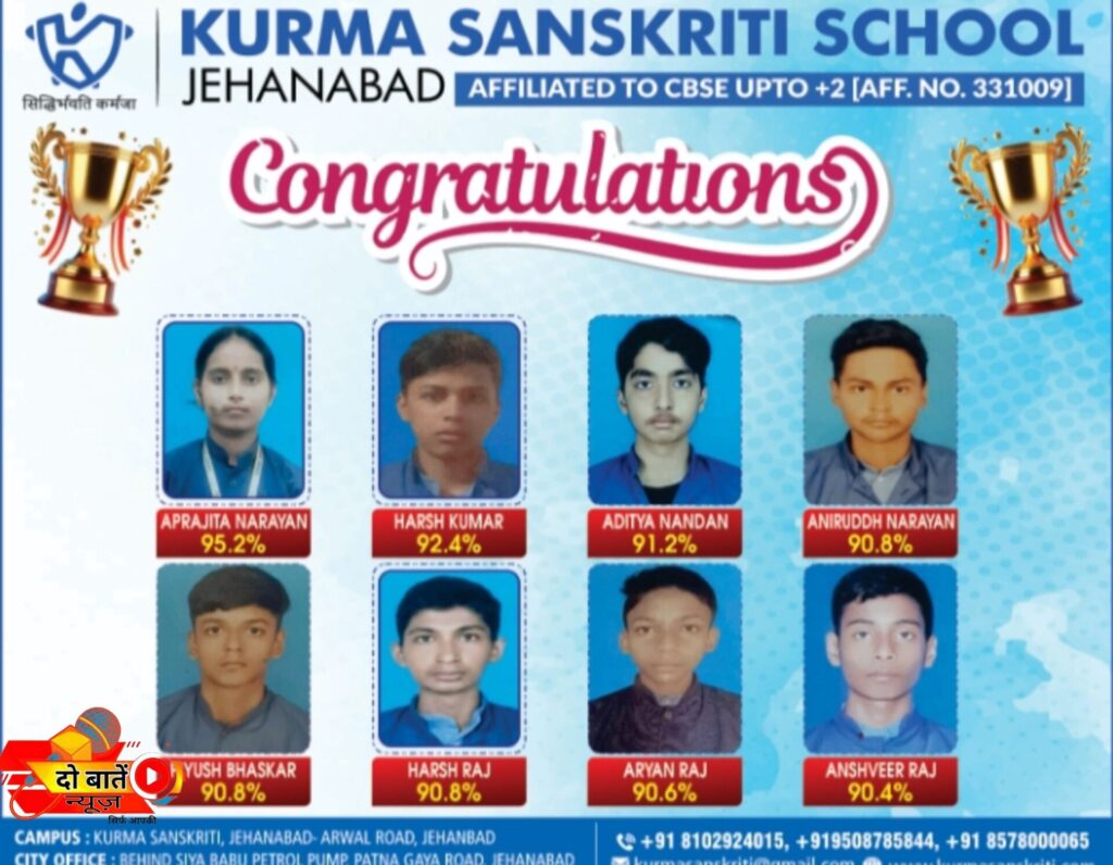 कुर्मा संस्कृति स्कूल, जहानाबाद के छात्रों ने वर्ष 2025 की कक्षा 10वीं बोर्ड परीक्षा में उत्कृष्ट प्रदर्शन करते हुए विद्यालय का नाम रोशन किया है। इस वर्ष विद्यालय का उत्तीर्णता प्रतिशत 100% रहा, जो विद्यार्थियों की मेहनत, शिक्षकों के समर्पण और विद्यालय की गुणवत्तापूर्ण शिक्षा प्रणाली का प्रमाण है।