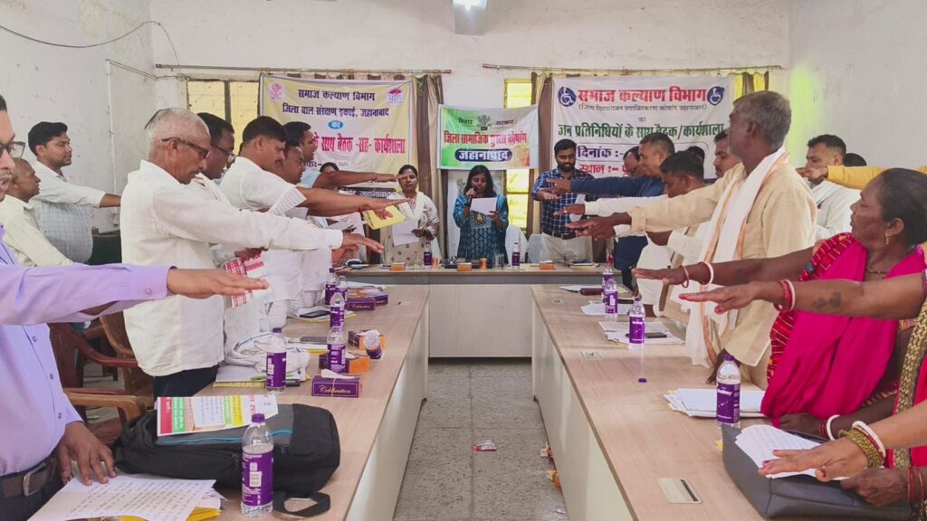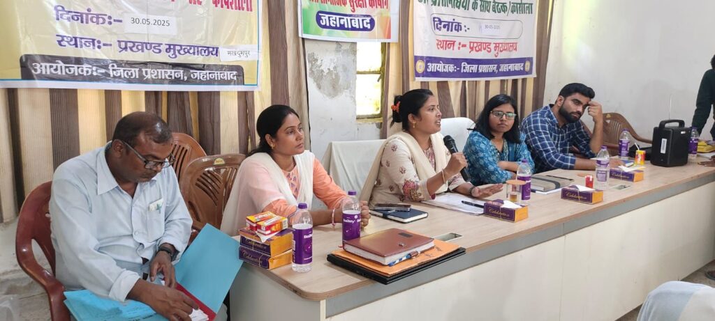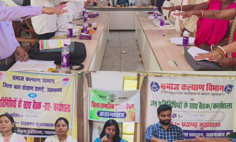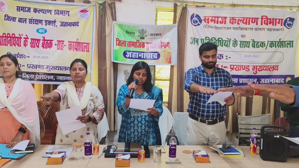 प्रखंड कार्यालय मखदुमपुर के सभा कक्ष में जिला दिव्यांगजन सशक्तिकरण कोषांग, जिला समाजिक सुरक्षा कोषांग ,जिला बाल संरक्षण इकाई अंतर्गत संचालित योजनाओं, बुनियाद केंद्र की सेवाओं एवं नशा मुक्त भारत अभियान से संबंधित जन जागरूकता एवं समीक्षा हेतु मखदुमपुर प्रखंड के सभी मुखिया, पंच ,सरपंच एवं वार्ड सदस्यों के साथ बैठक का आयोजन किया गया। बैठक की संयुक्त अध्यक्षता सहायक निदेशक, दिव्यांगजन सशक्तिकरण, श्रीमती माला कुमारी एवं सहायक निदेशक ,सामाजिक सुरक्षा ,श्रीमती पूनम कुमारी के द्वारा किया गया।